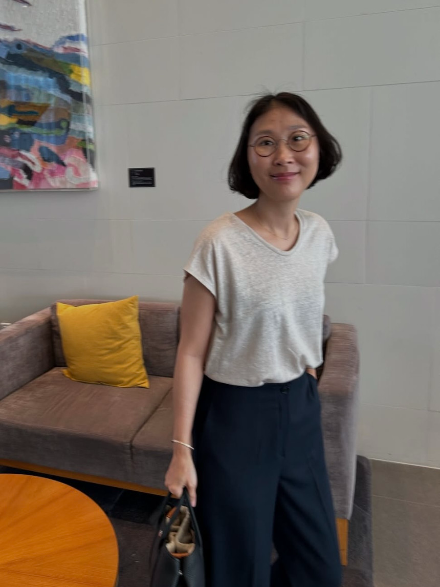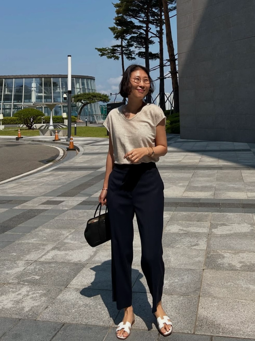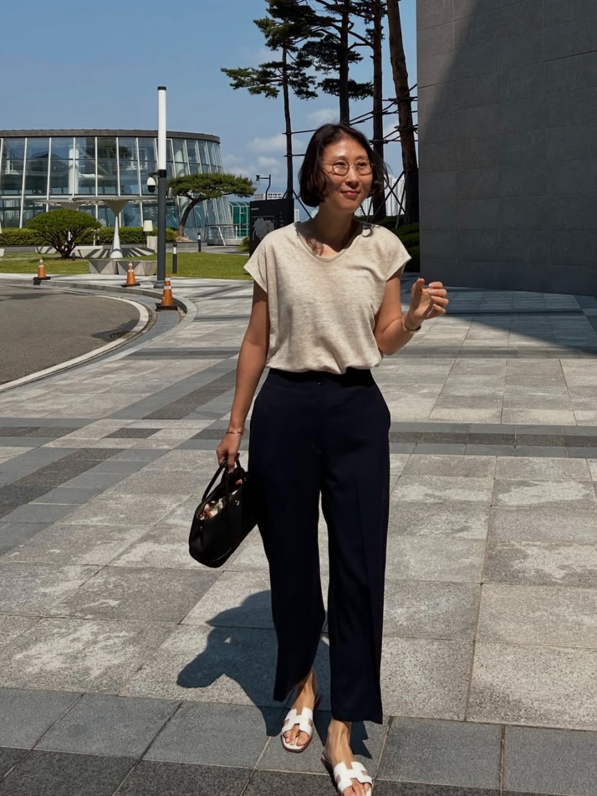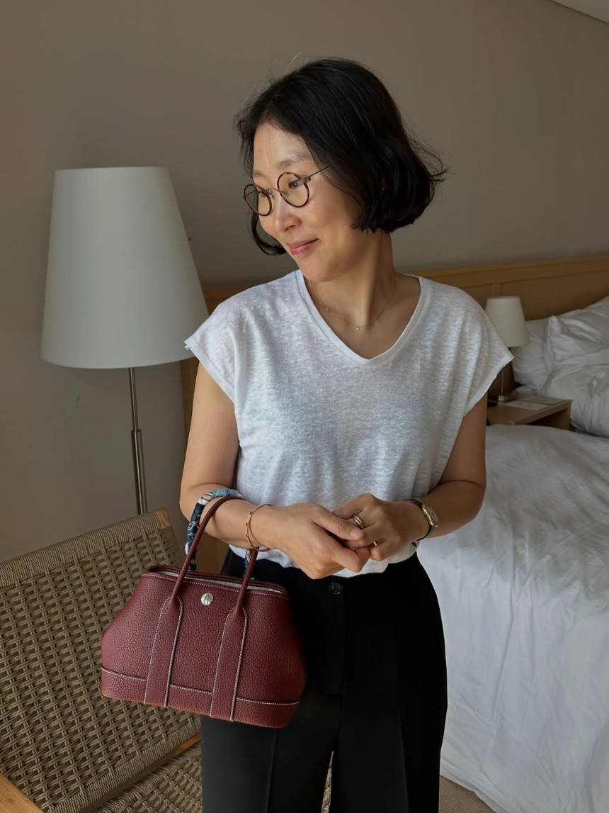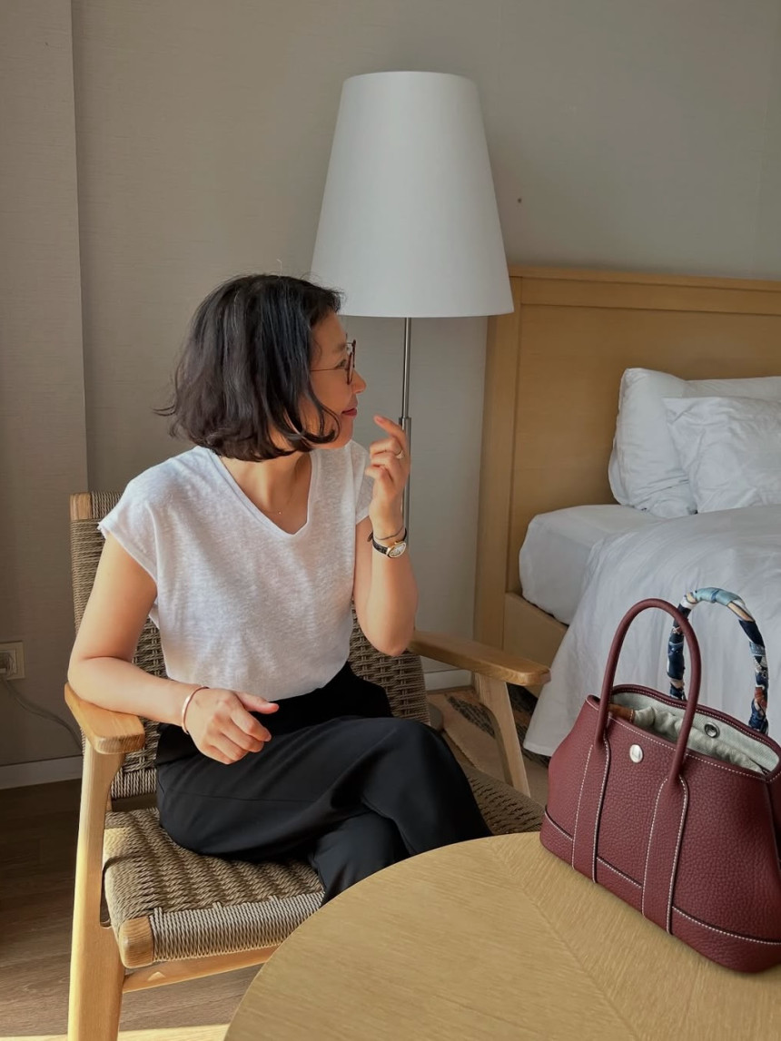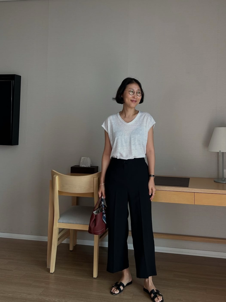 두께감 : 얇음 / 비침 : 보통(밝은컬러 비침) / 신축성 : 보통 / 안감 : 없음